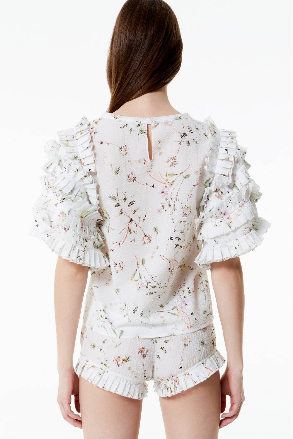 Purity in the lines and fresh floral print for the cotton T-shirt with rich pleated trimmings on the sleeves. Gritty over a pair of jeans, refined with character paired with the matching ALBERTA jogger trousers.Laura is 69 in. tall and in the picture she is wearing a size 40.