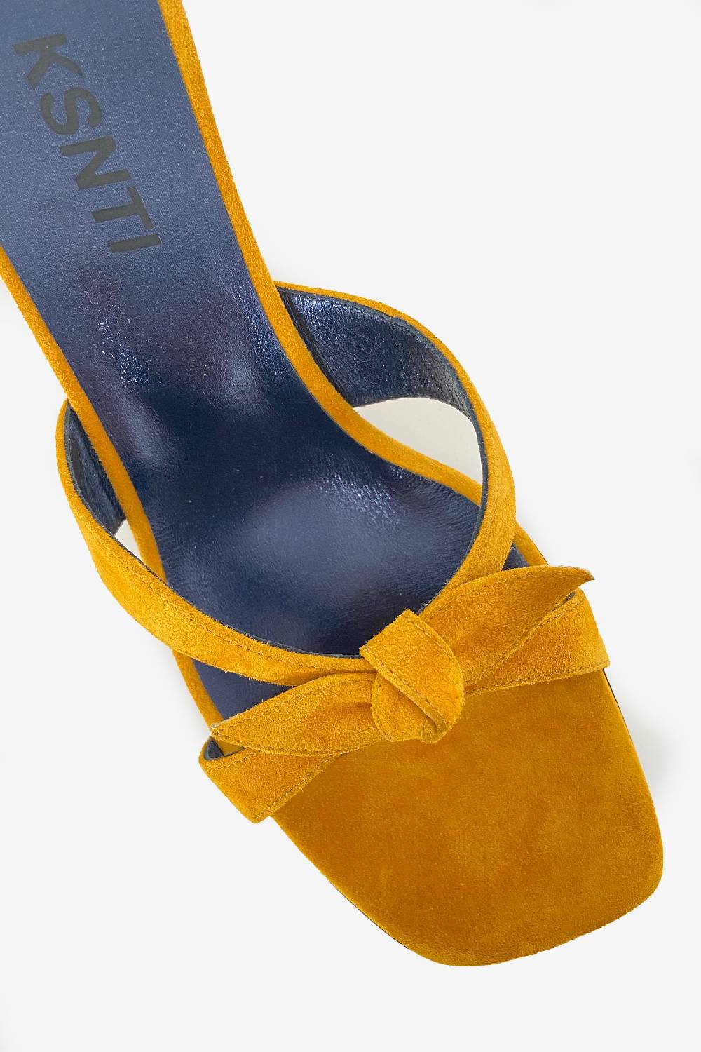 Suede sandals. Very comfortable and soft like a veil of powder, the suede slipper sandals to wear with all the models in the collection. They hug the foot with two bowed ribbons. 5cm spool heel.