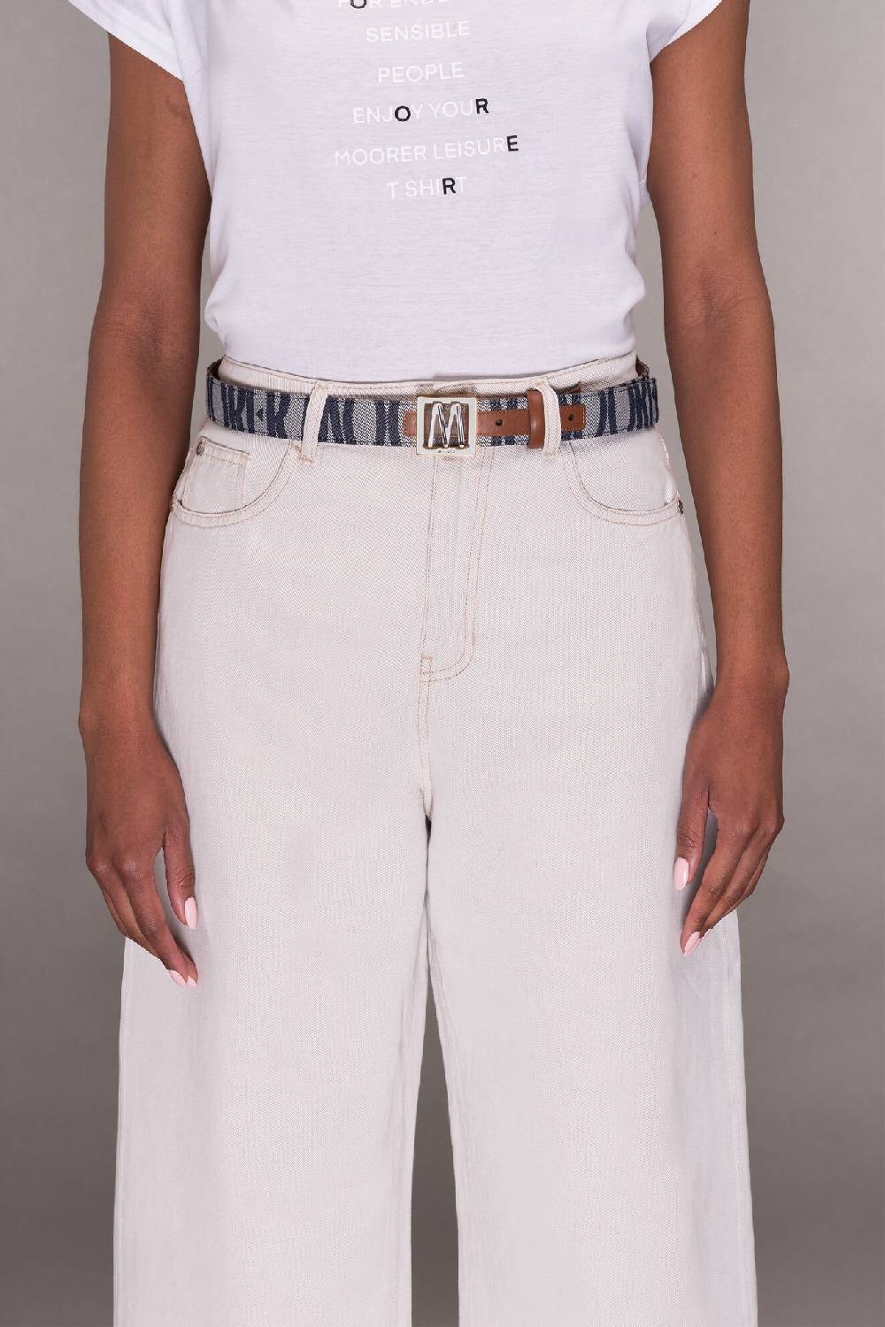 Cintura realizzata in morbida nappa bovina abbinata a un denim jacquard logato MooRER realizzato con filato bianco e Indaco ritorto. Leggermente lavato, il tessuto è connotato da alcune imperfezioni che ne rappresentano la peculiarità, conferendo pregio e carattere al materiale. Altezza cintura: 3 cm Chiusura con iconica fibbia quadrata in metallo con contrasti in lacca lucida dall’esclusivo design MooRER Dalla versatile portabilità può essere indossata sia a vita alta che bassa Made in Italy La modella è alta 175 cm e indossa una taglia MooRER IT 85. Le misure della modella sono: torace 81 cm, vita 67 cm, fianchi 92 cm.