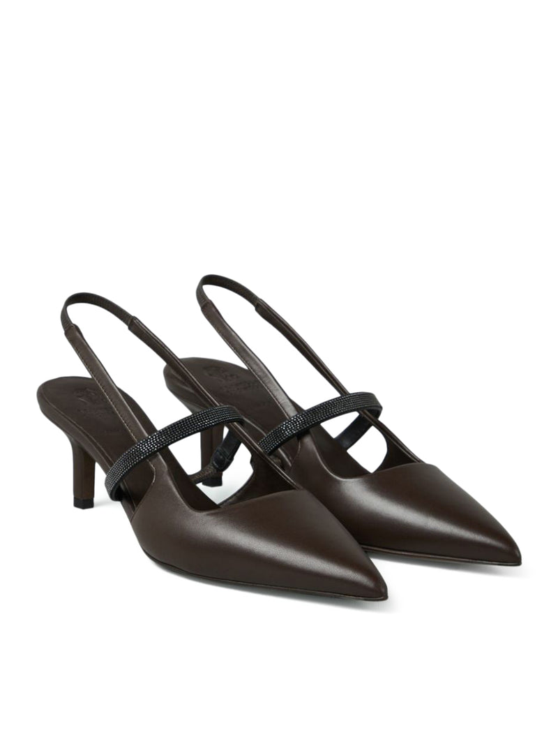- marrone- pelle- punta affilata- dettagli con cinturino- cinturino posteriore- soletta con marchio- tacco medio