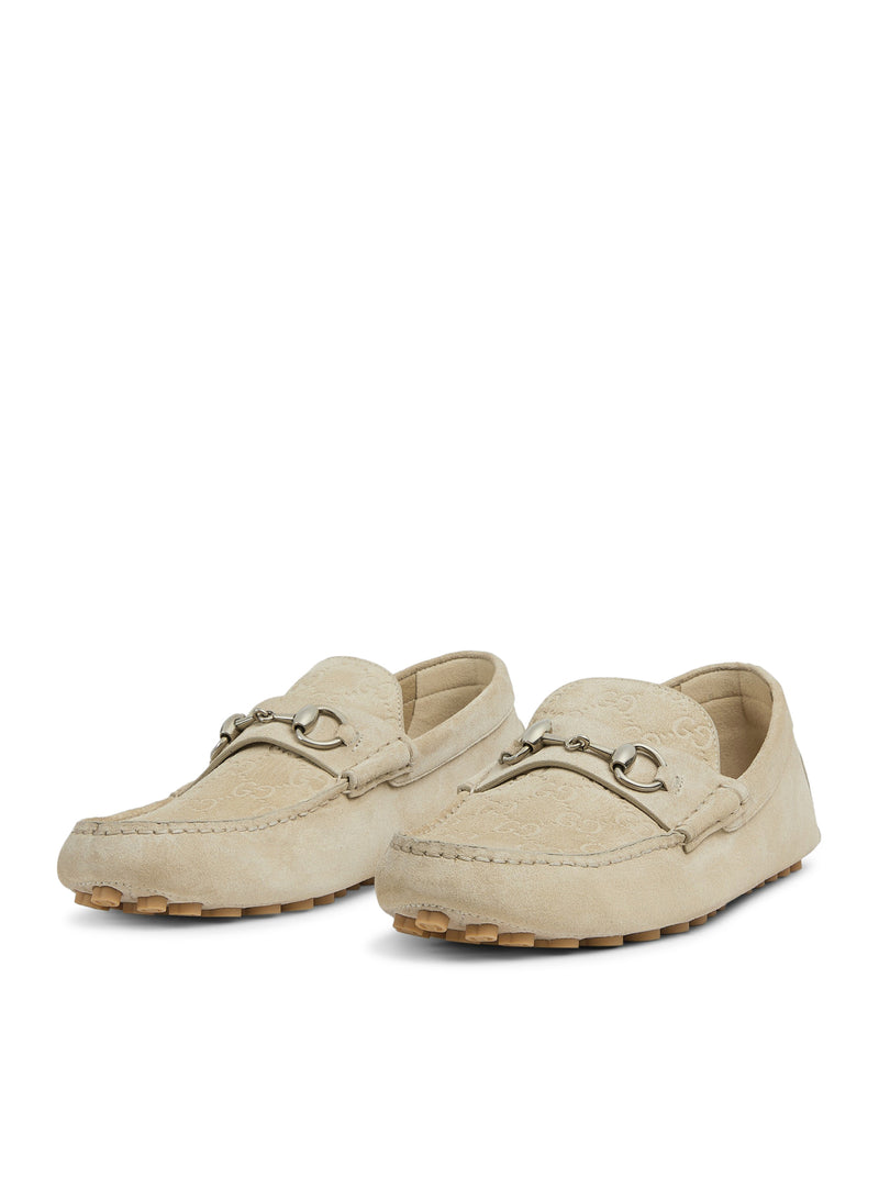 -Pelle scamosciata beige-Finiture color argento-Morsetto-Suola in gomma con gommini-Modello basso