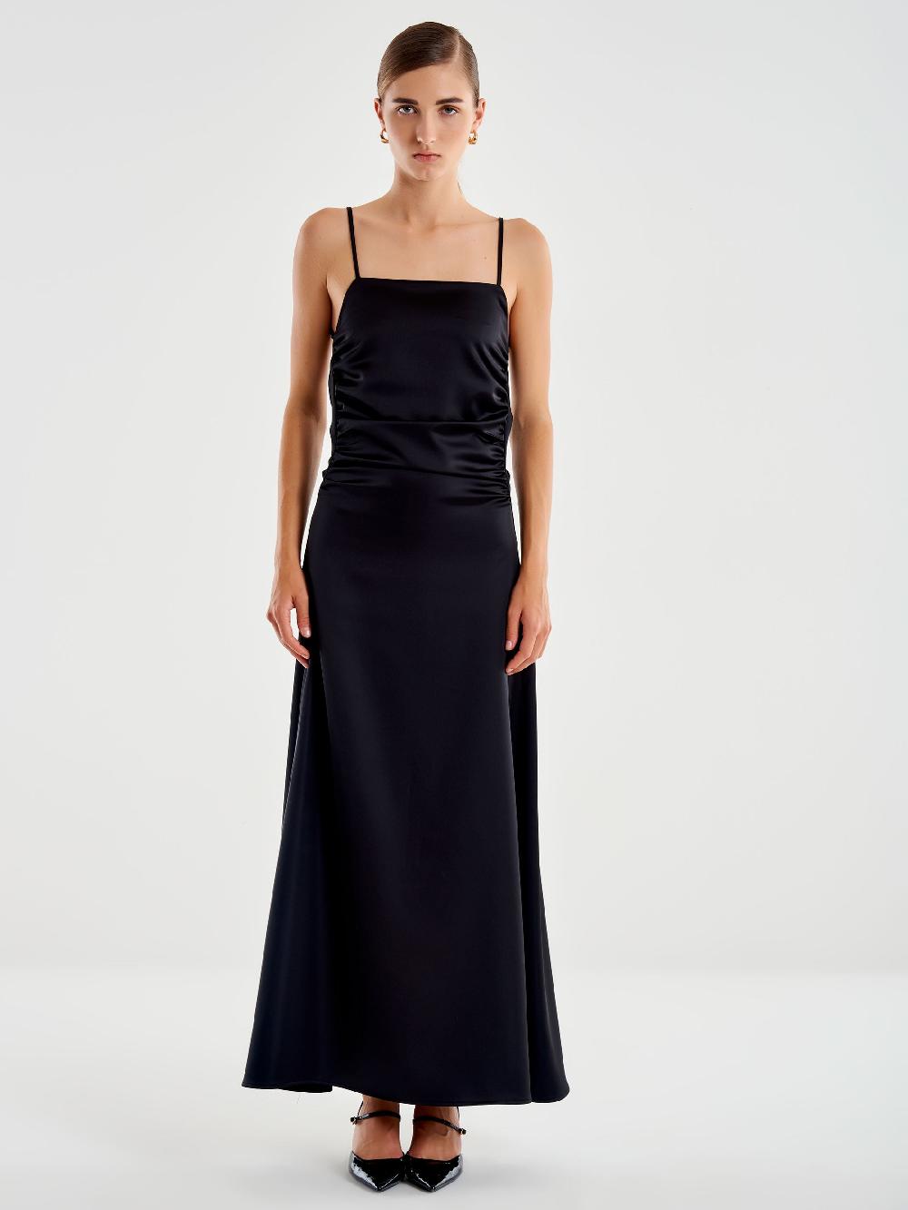 Abito lungo con spalline sottili, drappeggio frontale e posteriore. Schiena scoperta. Con laccio sottile. Chiusura posteriore con cerniera invisibile.